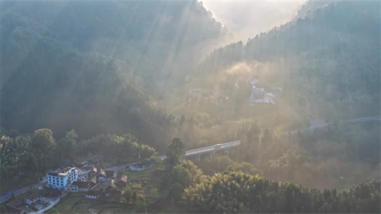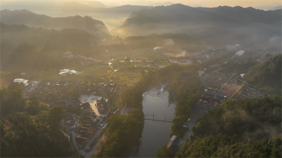 金秋时节,江口县寨沙侗寨日出云雾缭绕,山峦五彩斑斓,美如画卷。